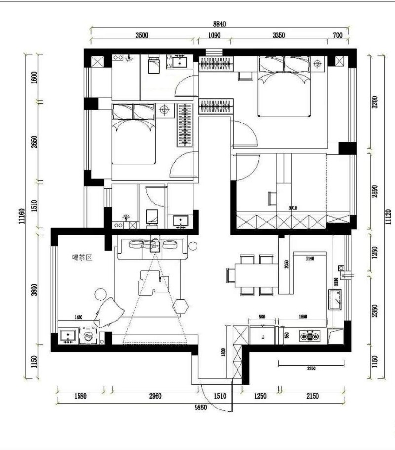 1.本户型为精心设计的三室两厅两卫结构,空间布局合理,动静分区明确,既满足了生活的私密性,又保证了活动的便捷。 2.客厅与餐厅相连,形成开阔的公共活动区域,便于家人及朋友聚会交流。 3.三个卧室分布合理,主卧配备独立卫生间,保证了主人的私密性和便捷性。