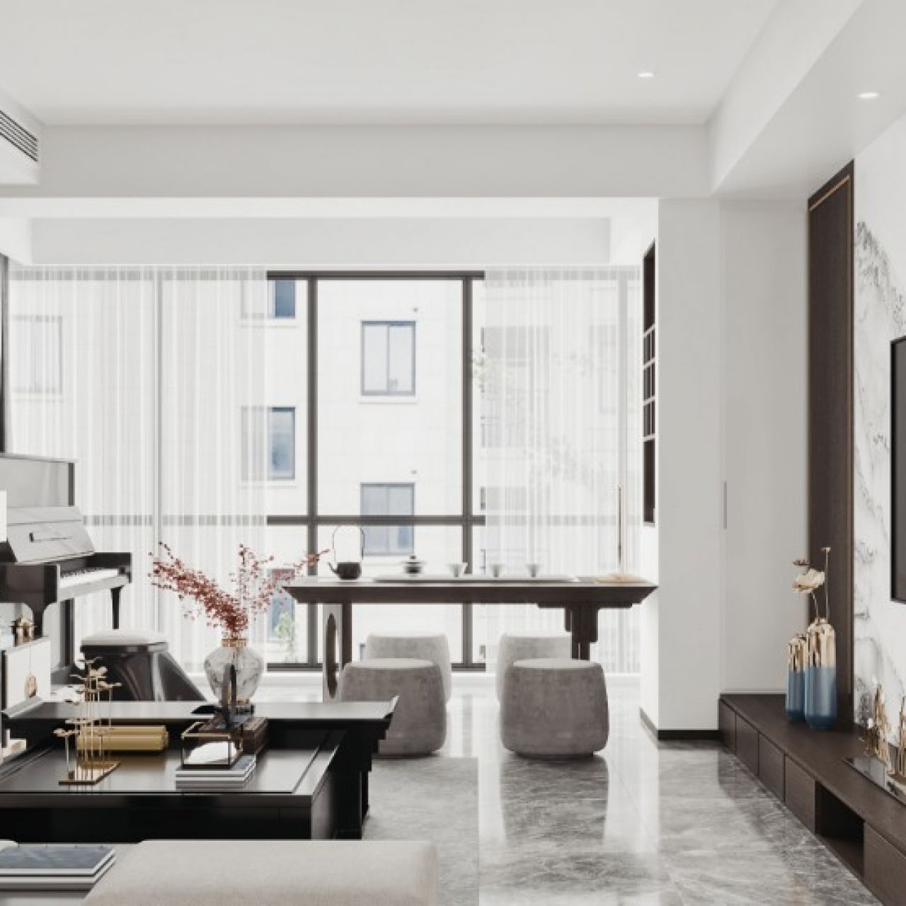 光透过窗帘,自由地在客厅里延展,赋予环境悠远自在的意境。