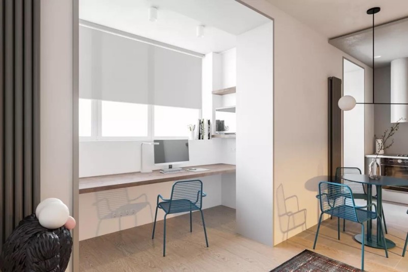餐厅在厨房和客厅的中间区域 三把蓝色的餐椅围着同系列餐桌摆放 顶部还有一盏简洁造型的吊灯 既渲染了用餐氛围 又有一定的装饰效果