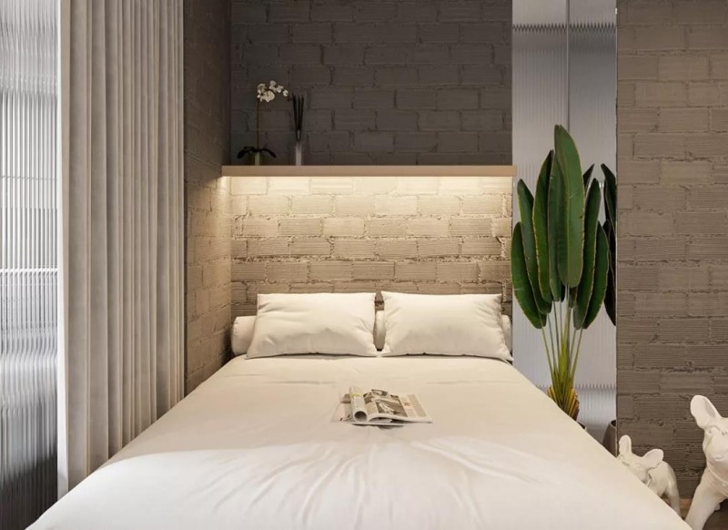 卧室在客厅后方 因为布局的关系采光并不是很好 所以设计师利用长虹玻璃做隔断墙 将自然光引入室内