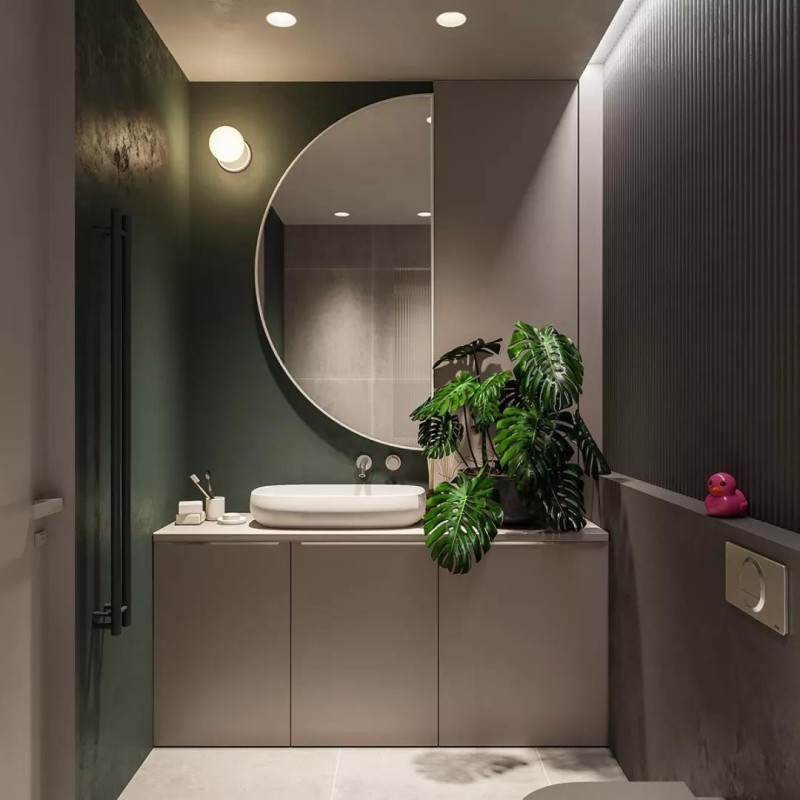 卫生间很有设计感 墨绿色系的主色调带来一定的浪漫情调 半圆形的镜子配上灯光的渲染 在视觉上造成了前后落差 看起来层次分明