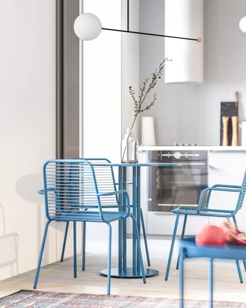 衣架的设计呼应了餐桌椅 蓝色的金属框架