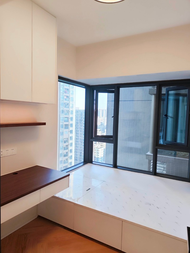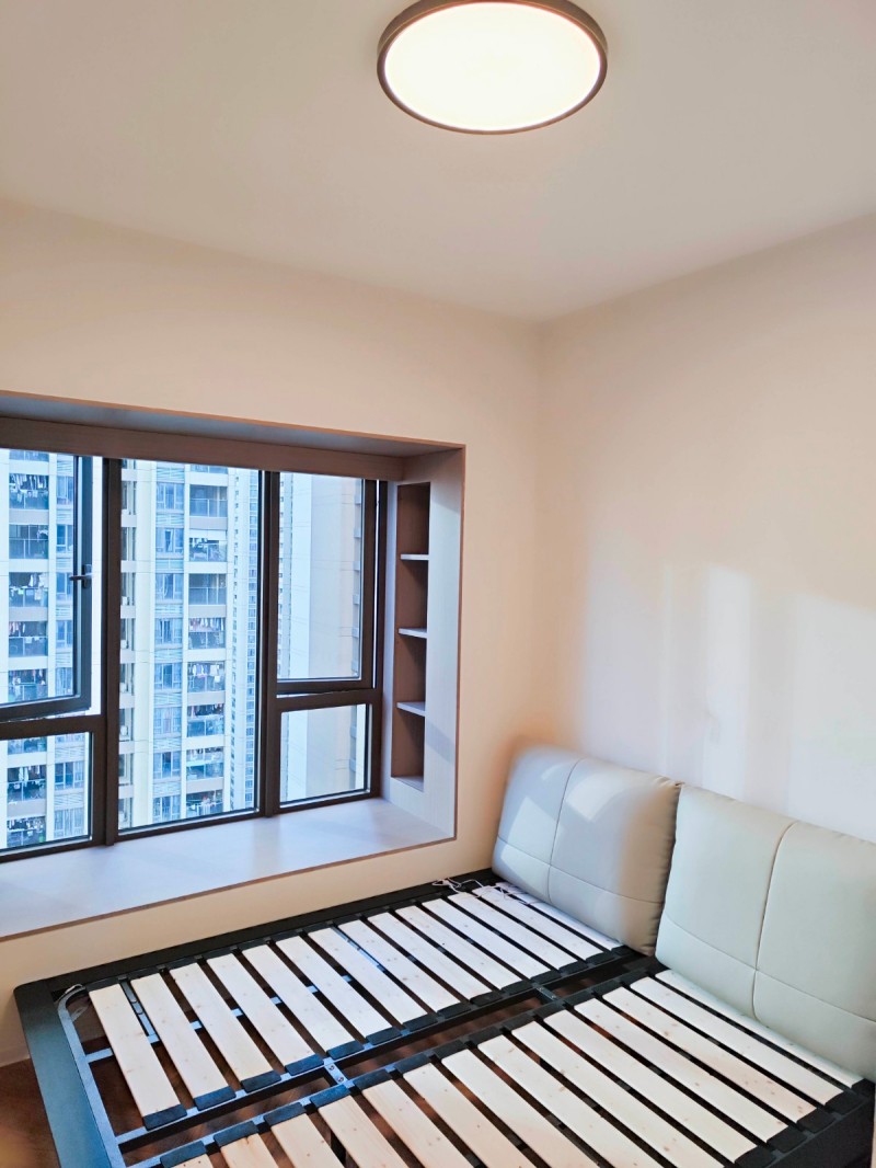 次卧同样也是以现代风为主,强调简约舒适,使用了温和的暖色系,给人一种温暖的包容感。打造了榻榻米床,收纳空间大而美观 一柜到顶的衣柜,干净利落,设计和线条感都超赞.