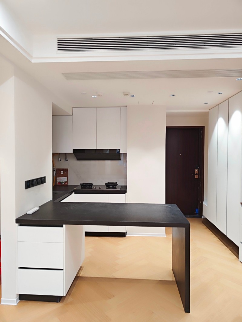 开放式厨房增加了空间感和互动性,而吧台功能则提供了一个舒适的用餐区域。台面可以增加温暖和自然的感觉,同时电器配置的全面也可以提高厨房的实用性.