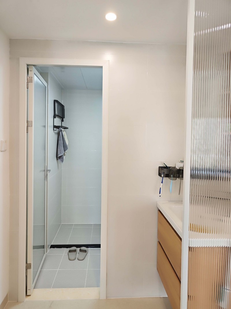 卫生间也改造成了干湿分离的半墙卫生间,选用的是带镜前灯的镜柜款,带灯的话水电阶段要预留好线,镜柜更实用,用的门连窗,玻璃有一定的透光性,感觉亮堂些,选用长虹玻璃.