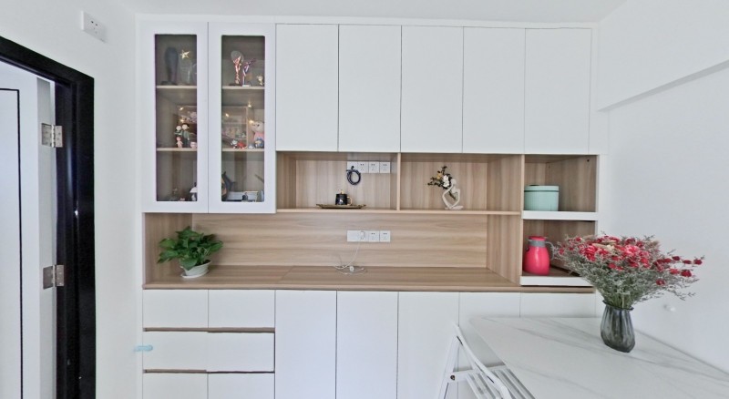 在客厅的右边打造一个餐厅柜,餐边柜高柜通顶设计,较大程度增加收纳的效果,中间镂空方便于日常物品拿取,少量玻璃门点缀,里面放东西不会显得杂乱又能够起到一定装饰作用