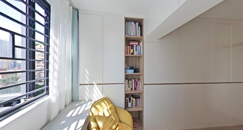 在主卧空间内设计一墙面的柜子,不仅满足储衣功能外,让空间保持整洁。再打造镂空柜子可以收纳一些书本.