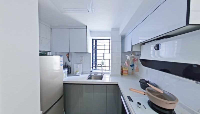 整体L型设计更为主流,洗、切、炒一气呵成,过道空间轻松转身享受与爱人一起烹饪,爱意也能更加分.开放式厨房增加了空间感和互动性.