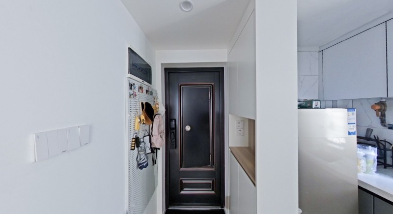 进门左边做一个简单的挂衣区,进门把外套、帽子、围巾、包包可以把它挂起来,不用到处乱放,出门时候可以顺手把它们穿上,即省时间又方便自己~ 开放格:中间位置设置了开放格,当我们一进门可以顺手放下钥匙、手饰、手机物品,日常也可以摆放植物、香薰,即满足了颜值,又实用.