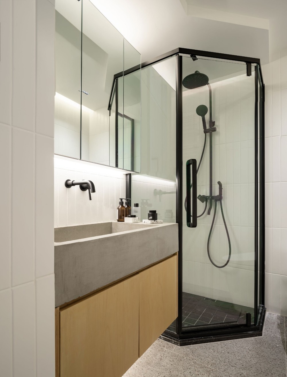 客卫内部是干湿分离的设计,大理石元素延伸至此,灰色墙地砖让整个卫生间显得简洁大方。洗手台底部的镂空空间也可作为收纳区。