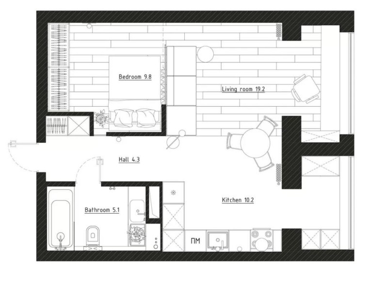客厅没有安装电视 只留了一面白墙做投影的幕布 保证了基本娱乐 也不占用地面空间