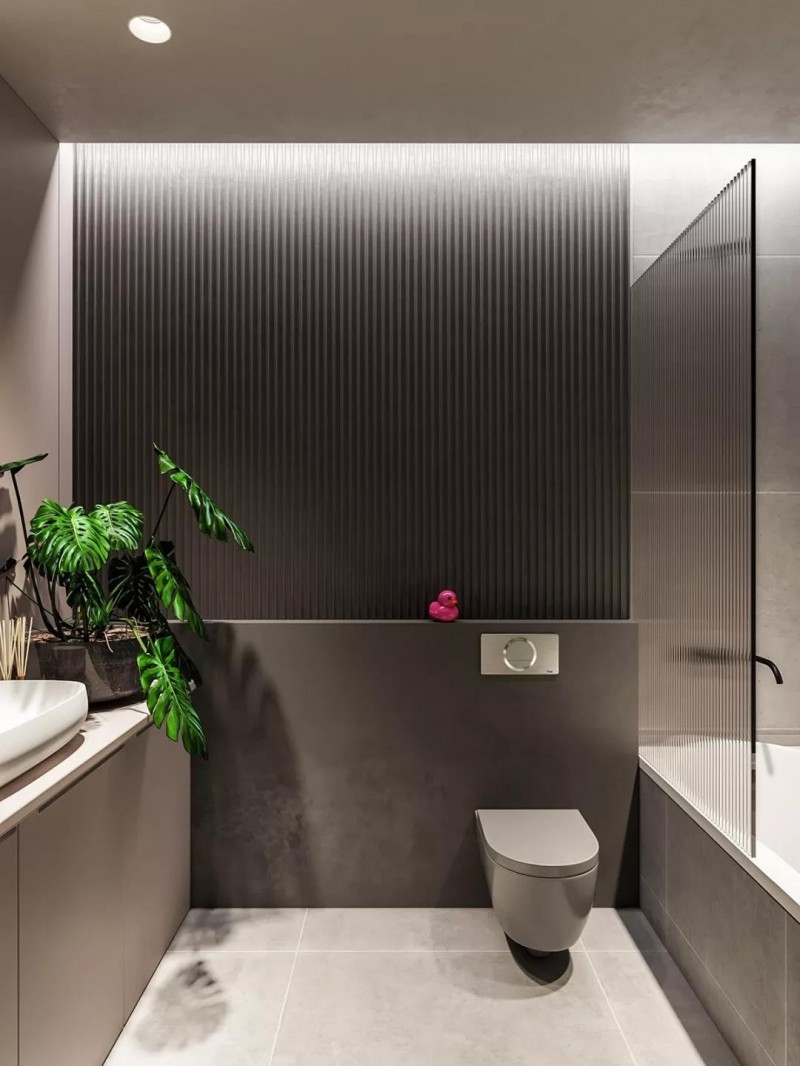 淋浴区和坐便区之间用玻璃做隔断 既有分离感 又不会显得太过压抑 顶部内嵌的灯带 也有效的拉升了层高