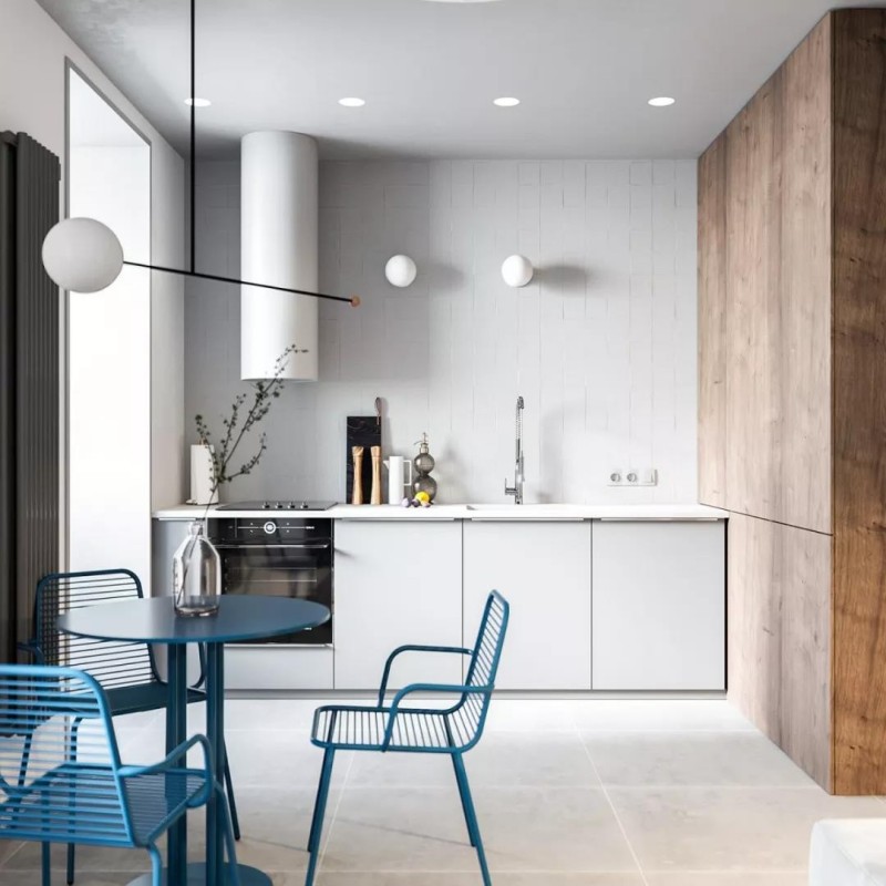 开放式的厨房 选用浅灰色的橱柜做收纳空间 圆筒形油烟机与球形壁灯相呼应 整体看起来非常和谐