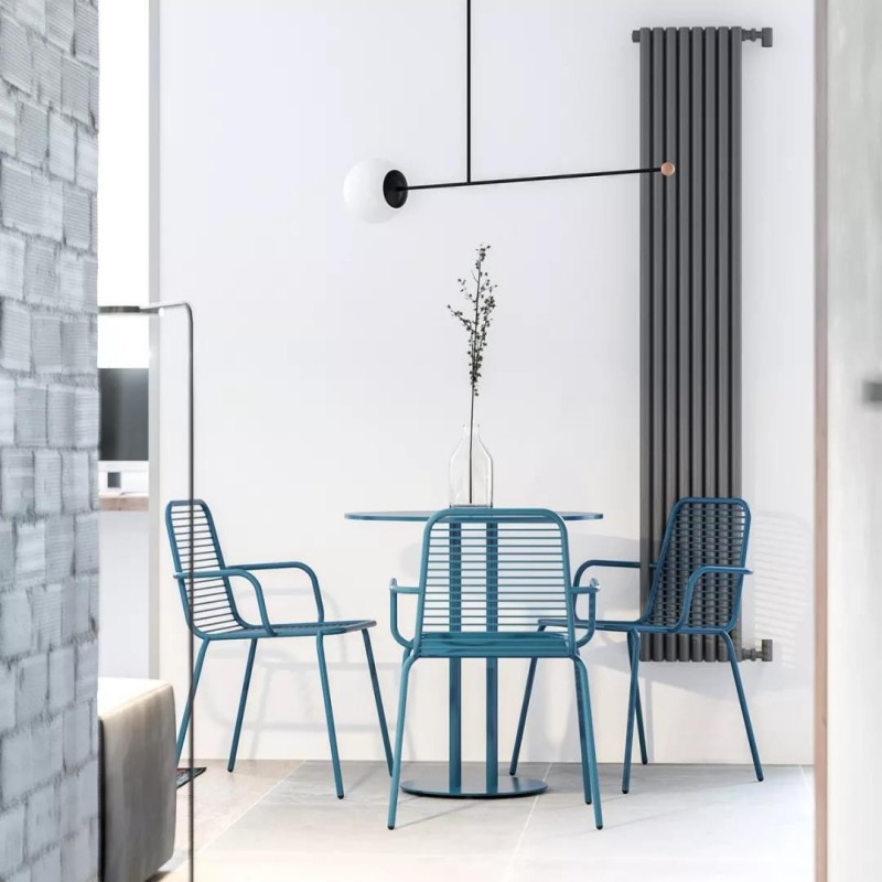 衣架的设计呼应了餐桌椅 蓝色的金属框架