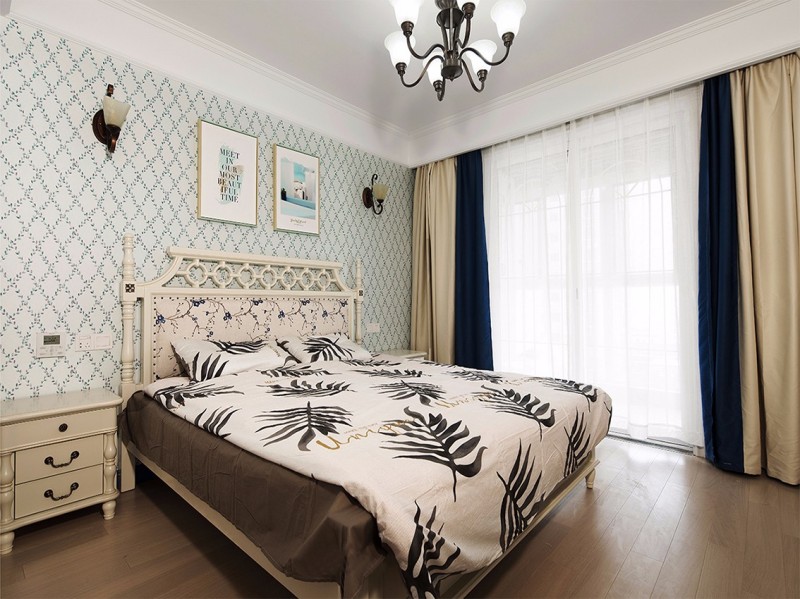 卧室以简洁清新为主,素雅的窗帘、蓝色的桌椅,配以梦幻且充满异域风情的壁纸,小憩初醒时有置身阳光沙滩、海水与海鸟共处之境,仿佛沐浴在海岸明媚的气息里。