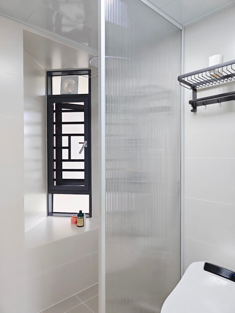 卫生间也改造成了干湿分离的半墙卫生间,选用的是带镜前灯的镜柜款,带灯的话水电阶段要预留好线,镜柜更实用,用的门连窗,玻璃有一定的透光性,感觉亮堂些,选用长虹玻璃.